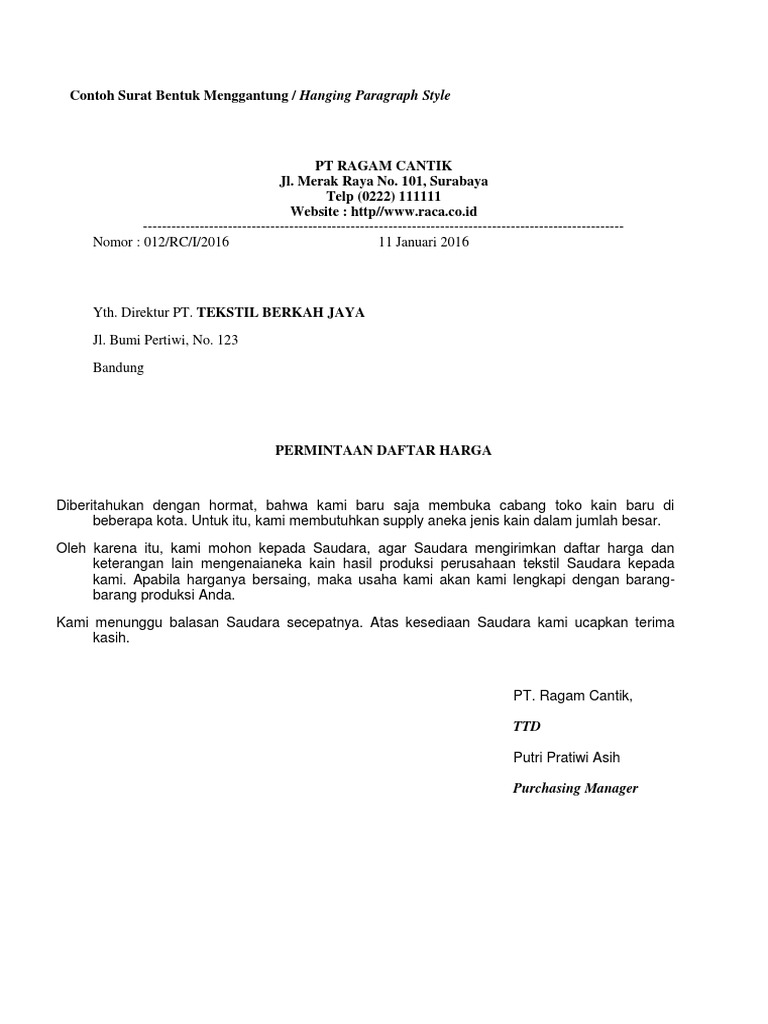 Setiap alinea pada surat bentuk menggantung ditulis secara menggantung. Dengan berbagai contoh surat yang telah banyak akan membantu kamu untuk mengetahui contoh surat resmi yang baik dan benar. Bentuk surat menggantung memang sedikit berbeda dan terbilang jarang digunakan dalam kegiatan. Surat memiliki banyak jenisnya salah satunya adalah contoh surat full block style. Jl.gamprit jati waringin pondok gede. Contoh bentuk surat menggantung hanging paragraph style. Salah satunya adalah surat bentuk menggantung. Penulisannya menggunakan kalimat baku dengan memperhatikan kaidah eyd. Contoh surat bentuk menggantung hanging paragraph style. Setelah kita membahas terkait contoh surat penawaran yang merupakan bagian dari surat resmi. Doc bullet bentuk surat resmi official style irma sari. Pada bentuk surat menggantung atau hanging paragraph style se tiap alinea nya memang berbentuk menggantung artinya hanya awal alinea yang dimulai dari margin kiri sedangkan baris. Surat resmi merupakan suatu surat yang diterbitkan oleh perseorangan, organisasi, ataupun instansi tertentu, yang bersifat formal serta berkepentingan resmi.